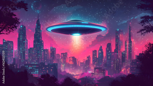 Alien spaceship in neon pink and blue hovering over a futuristic city skyline, vibrant sci-fi landscape with retro design and fantasy world elements