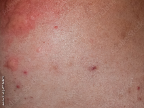 reaction, allergic, skin, inflammation, swelling, redness, medicine, health, showing, allergy, medicals, care, pain, red, painfully, close, closeup, health care, insect, surface, up, wound, attention, circle, danger, detail, fear, flesh, human, itchy, contagion, eczema, contagious, problem, rash, irritation, emollient, pink, sting, ointment, neck, ill, dermatology, irritable, virus, ugly, embarrassment, disease, painful