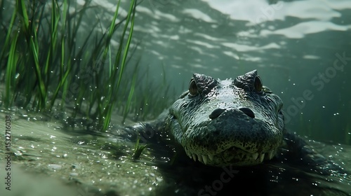 alligator, emerging, lurking, reptile, animal, underwater, swimming, closeup, head, face, eye, teeth, texture, skin, scale, grass, plant, stalk, flora, water, murky, submerged, wildlife, nature, predator, carnivore, swamp, river, outdoors, day, shallow, looking, view, menacing, dangerous, wet, ground, sand, environment, ecology