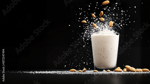 Almond milkshake splashing with whole almonds and powdered almonds on a dark background