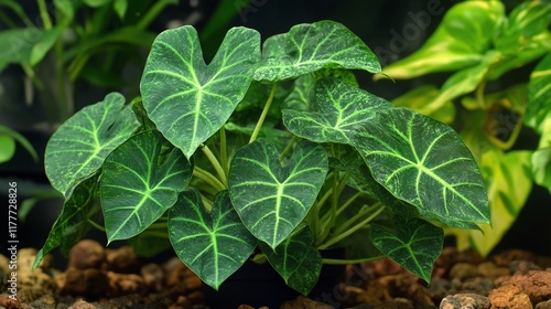 Alocasia plant, lush green leaves, indoor garden, botanical background, home decor