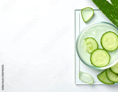 aloe, cucumber, slice, fresh, healthy, skincare, beauty, glasses, plate, natural, vibrant, green, liquid, gel, moisturiser, wellness, organic, product, ingredient, top, view, flat, lay, light, modern, simple, clean