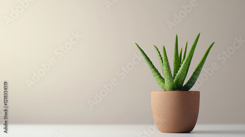Aloe vera plant in terracotta pot on minimalist table against neutral background, showcasing its vibrant green leaves and natural beauty