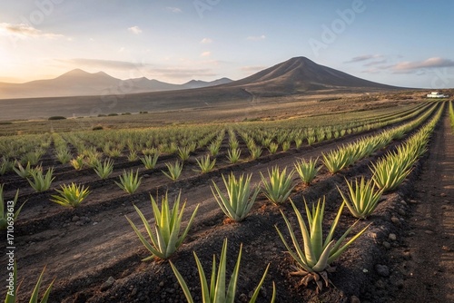 Aloe Vera Plantation at Sunset in Volcanic Landscape Wide view of aloe vera plants growing in orderly rows across volcanic soil at sunset, with mountains in the background.