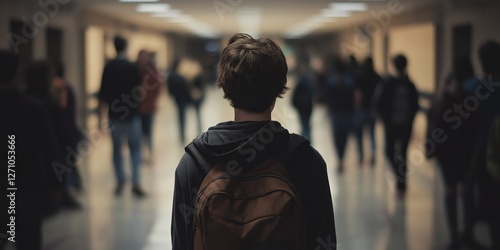 teenage, hallway, school, isolated, crowd, loneliness, hunched, solitude, quiet, feeling, disconnection, adolescence, pressure, isolation, urban