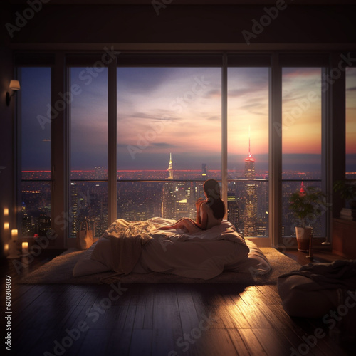 alone, young lady, bed, Manshon, hotel, tower, high floor, bed, nice view, sexy, morning glow, night view, sunset