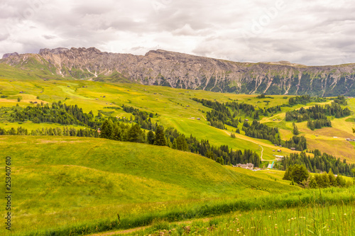 Alpe di Siusi, Seiser Alm with Sassolungo Langkofel Dolomite, a large green field with a mountain in the background