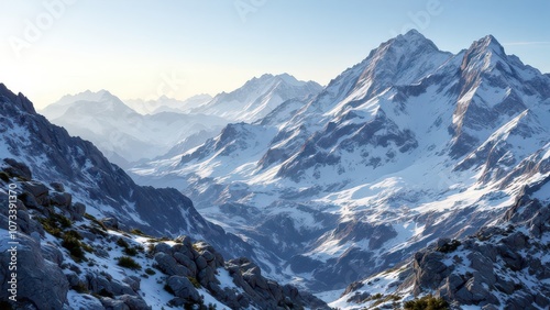 Alpine Landscape Under Clear Midday Sky, High-Resolution Mountain Photography with Precise Rock and Snow Textures