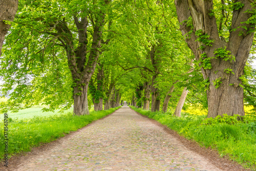 Alte Kastanienallee in Ostdeutschland mit Kopfsteinpflaster
