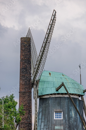 tractor, mill, windmill, tire, rim, lamp, cloud, hood
