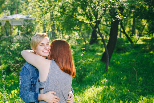 woman, couple, love, lesbian, gay, alternative, romantic, people, romance, human relationships, lifestyle, together, beautiful, happiness, girl, female, 2, cheerful, smiling, flirting, kiss, passion, desire, lover, friendship, affectionate, hug, togetherness, casual attire, street, park, affection, pretty, leisure, cute, touching, emotion, life, outdoors