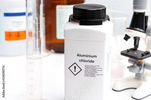 Aluminium chloride in bottle, chemical in the laboratory and industry