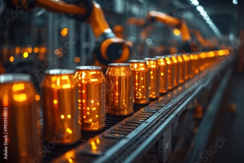 aluminium, can, conveyer, belt, factory, industrial, production, manufacturing, metal, line, row, automation, machinery, technology, process, assembly, cardboard box, drink, beverage, food, industry, shiny, metallic, orange, yellow, light, glow, dark, shadow, background, grey, steel, abstract, pattern, texture, closeup, perspective, depth, sharpened