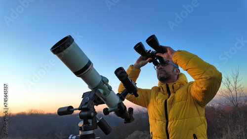 Amateur astronomer observing skies with binoculars and telescope.
