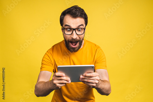 Amazed happy bearded man using digital tablet looking shocked about social media news, astonished man shopper consumer surprised excited by online win isolated over yellow background.