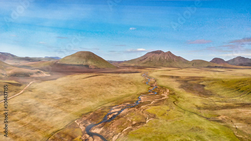 Amazing landscape of Landmannalaugar magnificent highlands in summer season, aerial view from drone, Iceland
