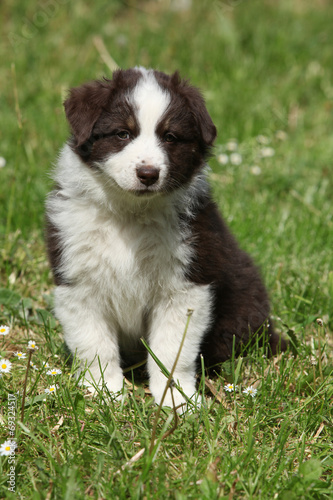 Amazing puppy of australian shepherd sitting in the grass