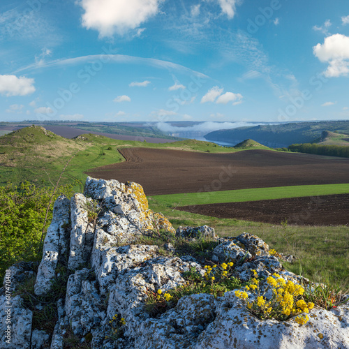 Amazing spring view on the Dnister River Canyon with picturesque rocks, fields, flowers. This place named Shyshkovi Gorby, Nahoriany, Chernivtsi region, Ukraine.