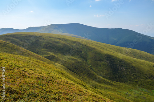 Amazing sunny landscape with grass green hills at Carpathian mountains under blue sky. Borzhava ridge, Ukraine