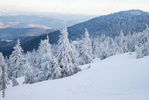amazing winter landscape with snowy fir trees in the mountains