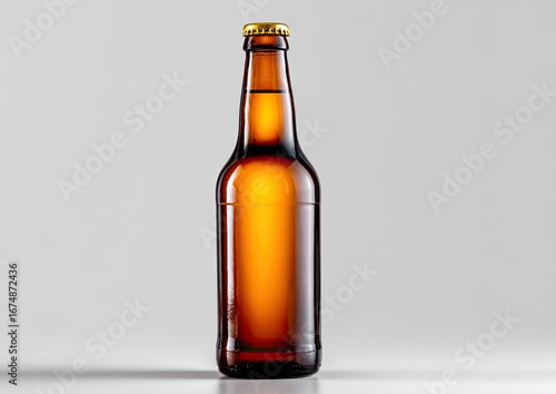 Amber beer bottle, front view. Gold cap. Empty, studio shot
