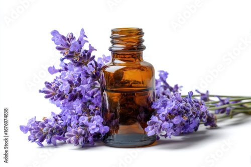Amber bottle of lavender essential oil, surrounded by fresh lavender blossoms