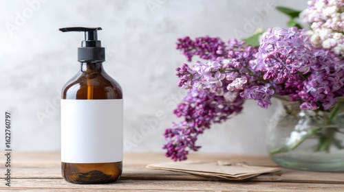 bottle, amber, blank, label, pump, lilac, bouquet, flower, spring, beauty, organic, natural, spa, home, care, product, glasses, wooden, table, rustic, pretty, fragrance, floral, purple, fresh, blooming, elegant, simple, design, cardboard box, cosmetic, moisturiser, lotion, soap, shampoo, clean, health, wellness, essential, ingredient, eco, sustainable, modern, minimalist