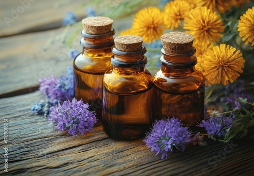 bottle, amber, cork, flower, wood, rustic, essential, oil, aromatherapy, lavandula, purple, yellow, floral, nature, natural, wellness, health, spa, treatment, herbal, medicine, alternative, homeopathy, vintage, antique, closeup, still, life, beauty, aromatic, fragrance, scent, therapy, serene, calm, peaceful, relaxing, vibrant, bright, botanical, wooden, table, surface, bloom, blossom, spring, summer, decorative, arrangement