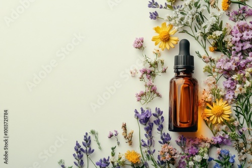 Amber Dropper Bottle Surrounded by Flowers on Soft Background