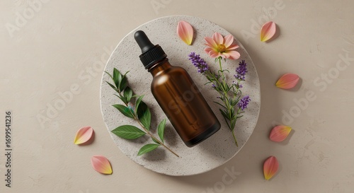 bottle, dropper, amber, glasses, essential oil, serum, skincare, beauty, cosmetic, product, natural, organic, flower, pink, yellow, lavandula, green, leaf, plant, floral, spa, wellness, aromatherapy, treatment, health, care, nature, background, texture, stone, plate, round, circle, design, composition, still life, topview, minimalist, elegant, clean, fresh, soft, light, neutral, beige