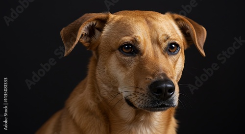 dog, canino, pet, animal, mammal, portrait, head shot, brown, tan, fur, ear, eye, nose, mouth, face, expression, serious, calm, attentive, looking, background, black, studio, lighting, mixed breed