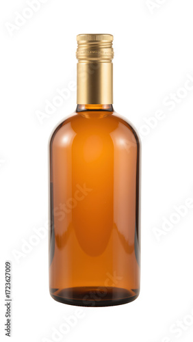 Amber glass bottle with gold cap, ideal for beverages or oils, showcasing sleek design and smooth surface