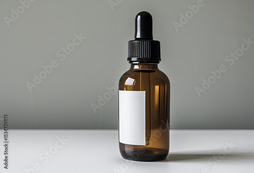 Amber glass dropper bottle with a blank white label on a minimalist grey background, ideal for cosmetic mockups.