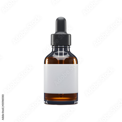 Amber glass dropper bottle with blank label isolated on transparent background.