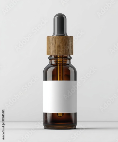 Amber Glass Dropper Bottle With Wooden Cap and Blank Label, Ideal for Branding and Product Marketing in the Beauty and Wellness Industries : Generative AI