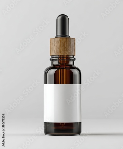 Amber glass dropper bottle with wooden cap and white label on plain gray background for natural skincare or essential oil product presentation