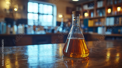 Amber liquid in an Erlenmeyer flask sits on a polished wood surface. A blurred background suggests a scientific or laboratory setting.