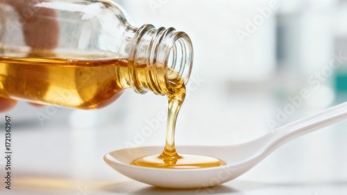 Amber liquid pours from a clear glass bottle onto a small, white spoon, showcasing a smooth, golden stream against a soft, out-of-focus background.