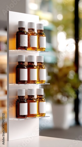 bottle, pharmacy, display, shelf, amber, health care, pharmaceutical, chemist's shop, retail, product, label, cardboard box, health, wellness, treatment, remedy, medication, prescription, dispensary, apothecary, store, shop, interior, background, blurred background, bokeh, natural light, copy space, template, design, branding, presentation, arrangement, order, neat, organised, variety, selection, stock, supply, business, commercial, marketing