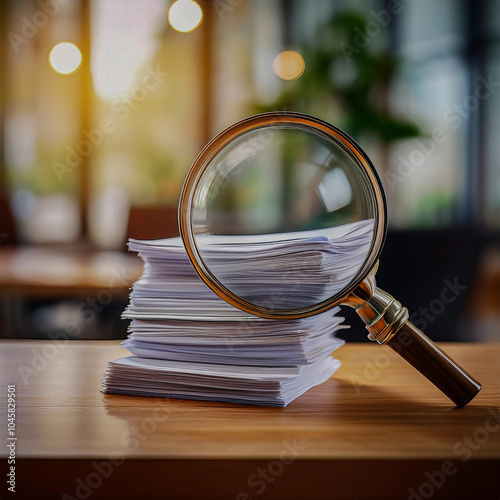 Ambiente de escritório iluminado por luz natural, com uma lupa e documentos organizados para leitura e pesquisa.