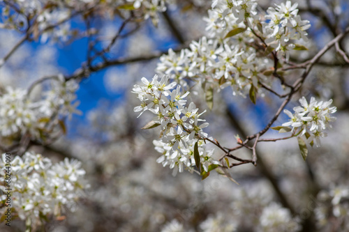 Amelanchier lamarckii deciduous flowering shrub, group of snowy white petal flowers on branches in bloom
