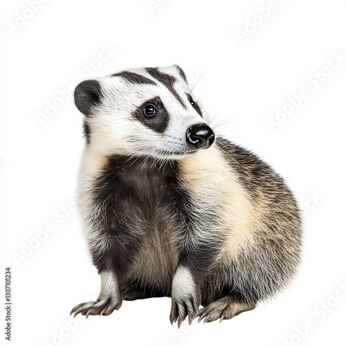 badger, american, animal, wildlife, isolated, white background, curious, mammal, fur, black-and-white, nature, wild, predator, carnivore, north america, forest, cute, small, claw, face, eye, ear, whisker, sitting, portrait, natural, environment, outdoors, fauna, species