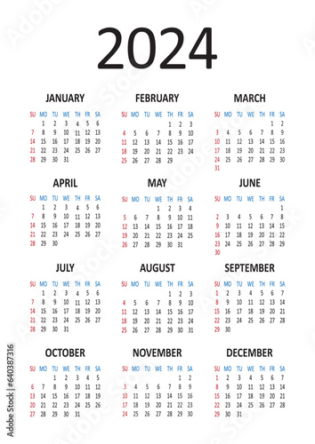 American calendar 2024 year. Week starts on Sunday. Vector illustration