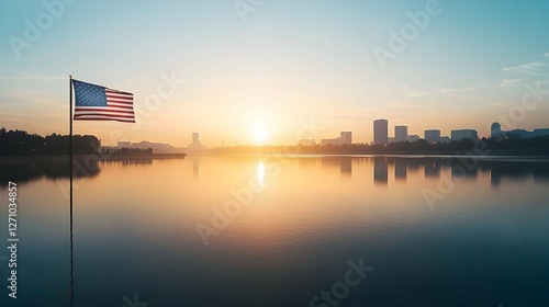 flag, american flag, sunrise, city skyline, water, lake, dawn, morning, patriotic, us, american, landscape, city, building, horizon, sky, blue skies, orange sky, calm, peaceful, serene, tranquil, still, quiet, golden hour, light, sun, bright, beautiful, scenic, view, urban, nature, outdoors, summer, day, travel, photo, image, photo, picture, royalty free
