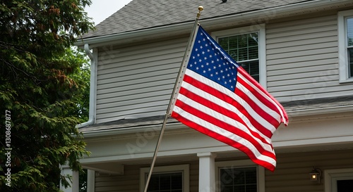 flag, american, house, home, residential, building, flag pole, star, stripes, red, white, blue, patriotic, national, symbol, country, freedom, liberty, independence, democracy, nation, government, residential area, suburban, exterior, property, yard, dwelling, architecture, facades, siding, porch, column, tree, greenery, waving, wind, fabric, textile, display, showing, visible, prominent, american flag, patriotism