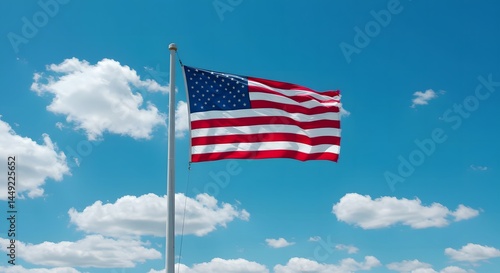 American Flag Waving Proudly Against Blue Sky with White Clouds