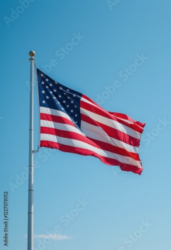american flag, waving, sky, blue background, patriotic, freedom, sunlight, flag, red, white, blue, vibrant, us, independence, celebration, clear sky, pride, daylight, holiday, america, vivid colors, oneness, heroism, sunny, majestic, holiday spirit, tribute, clear day, peaceful
