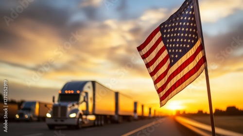 flag, truck, highway, sunset, landscape, transportation, driving, road, vehicle, communication, freedom, journey, travel, nature, sky, cloud, horizon, symbol, patriotism, america, infrastructure, logistic, adventure, scenery, dusk, industry, road, destination, service, cargo, express, delivery, modern, truck driver, movement, flag pole, urban, community, scenic view, open road