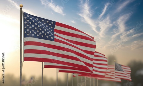 flag, american, patriotic, wave, wind, red, white, blue, star, stripes, symbol, country, nation, oneness, freedom, independence, background, image, illustration, graphic, design, vector, texture, fabric, pole, day, sky, cloud, sunrise, sunset, light, soft, peaceful, patriotism, national, pride, america