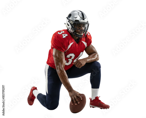 american football, player, athlete, football, sport, uniform, helmet, jersey, ball, kneeling, red, isolated, white background, professional, studio, cut-out, competition, game, team, training, fitness, strong, powerful, active, male, adult, man, pant, silver, equipment, pose, determination, marketing, advertising, banner, website, presentation, graphic design